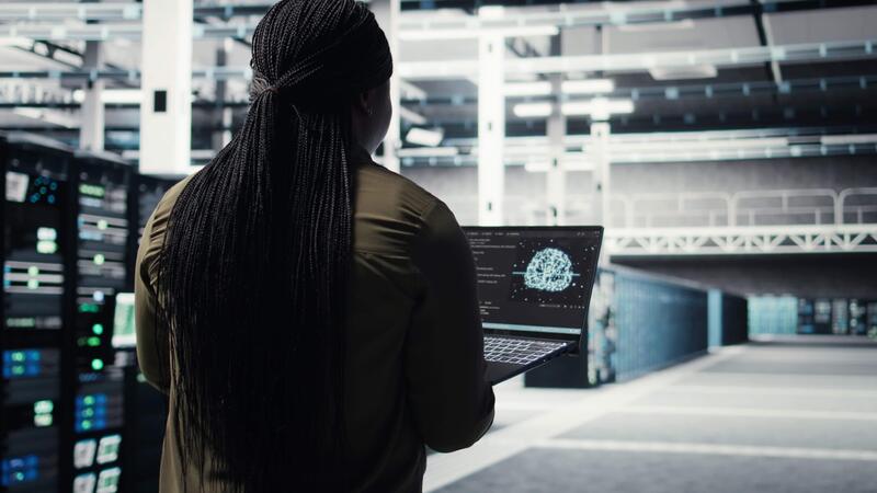 Computer scientist doing data center automation using AI on laptop. Server room IT specialist implements machine learning driven predictive maintenance systems using notebook, camera A Pro Video