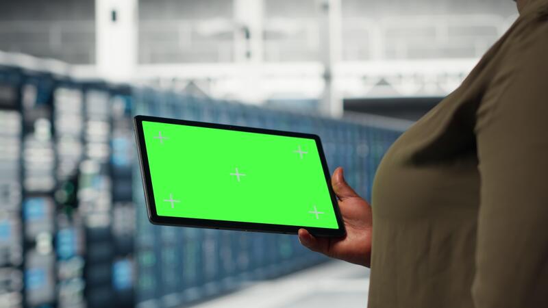 IT professional in data center using green screen tablet to ensure error free supercomputers networks. African american woman uses mockup device to monitor server hub gear parts for failures, camera B Pro Video