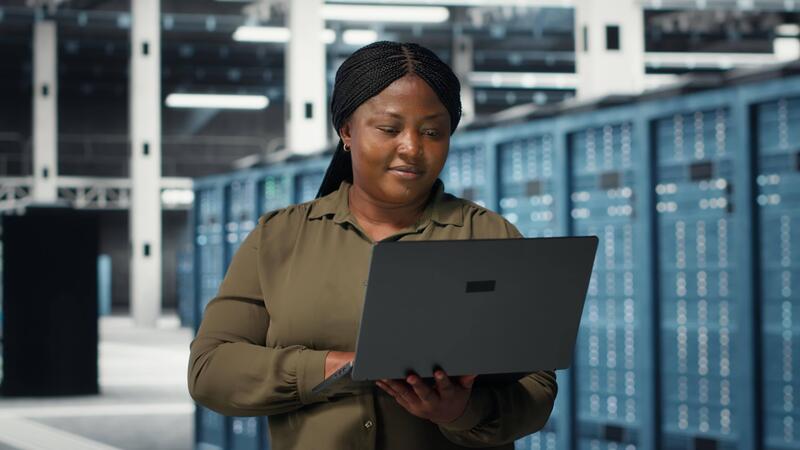 Programmer in data center using laptop to upgrade systems for increased stability. IT professional in server farm configuring infrastructure with notebook for optimum performance, camera B Pro Video