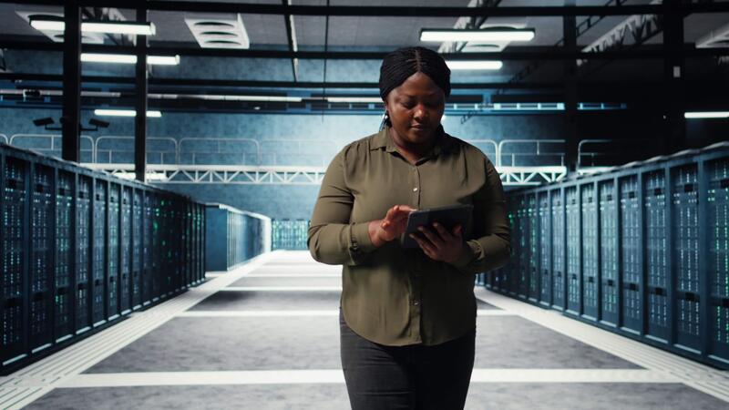 Data center employee using tablet to manage software updates for system stability. African american engineer in server room configuring infrastructure with device for optimum performance, camera A Pro Video