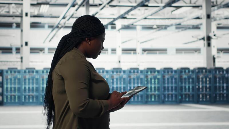 Technician walking in data center with tablet, checking hardware for system stability. Worker overseeing server farm with device, configuring infrastructure rigs, camera B Pro Video