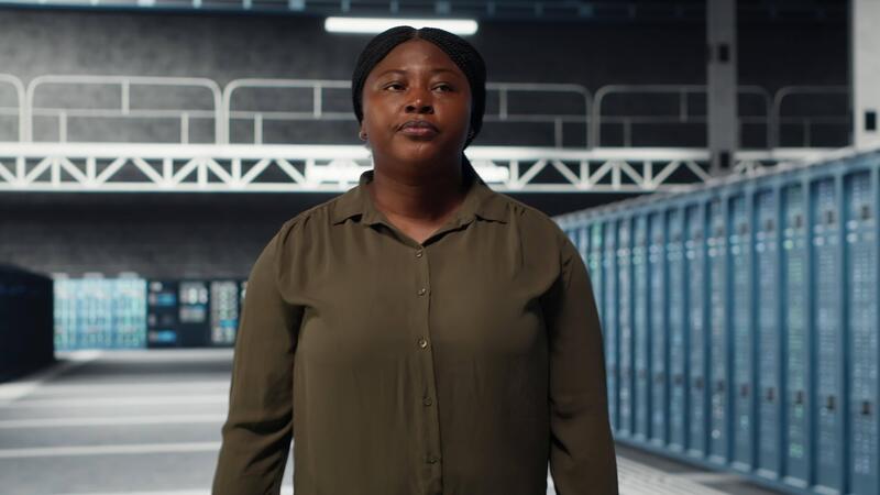 Admin walking in data center, overseeing large scale IT infrastructure to maintain seamless operations. Server farm employee doing network management for increased uptime, camera B Pro Video