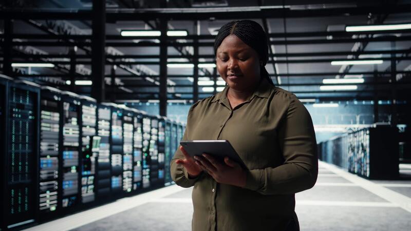 Programmer in data center using tablet to upgrade servers for increase in clients workload capacity. IT specialist in server farm configuring hardware rigs, improving data processing speed, camera A Pro Video