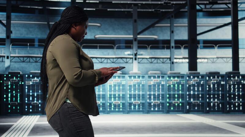 Smiling data center technician using tablet to manage software updates for system stability. Upbeat IT expert in server room configuring infrastructure with device for optimum performance, camera A Pro Video