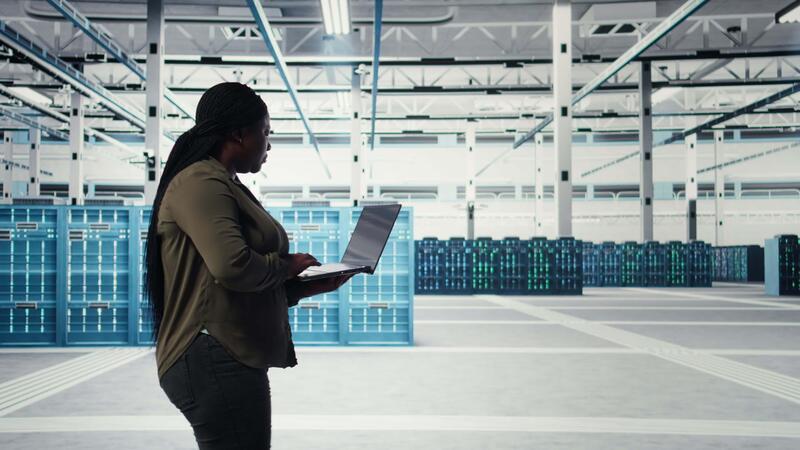 Technician with laptop walks through data center server rows, implementing advanced power management solutions. Worker using notebook to oversee server hub, reducing energy consumption, camera A Pro Video