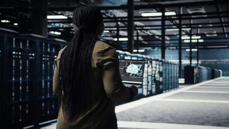 Data center engineer using deep learning on laptop to optimize operations efficiency. IT expert working in server room with specialized hardware accelerating complex AI calculations, camera A Pro Video