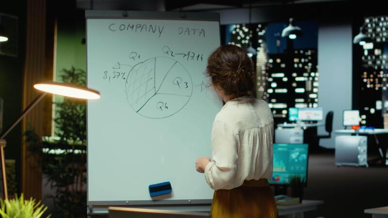 Woman scribbling predictions on white board and checking insights on laptop. Worker assessing finance data, summarizing numbers for projections and organizing administrative report. Camera B. Pro Video