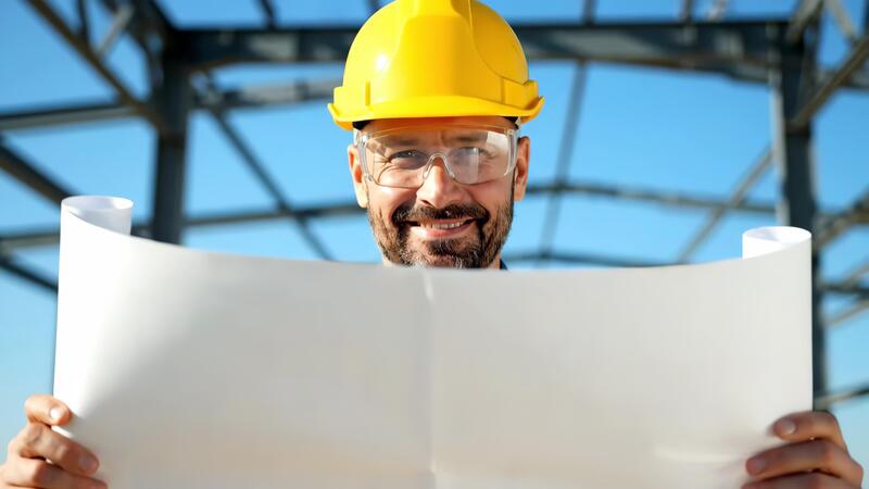 Happy Construction Worker on a Sunny Day at a Building Site Holding Blueprints With Structural Steel Framework in the Background Pro Video