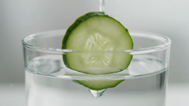 Cucumber Slice Drips Into Glass of Water for Hydration in a Studio Setting Pro Video