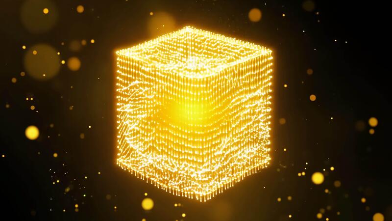 Golden Cube of Light Points Floating in Black Space, Abstract Technology From Future Pro Video