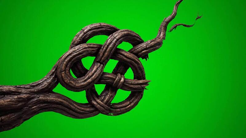 a gnarled tree root that grows and twists into a complex celtic knot pattern on a green sc Pro Video