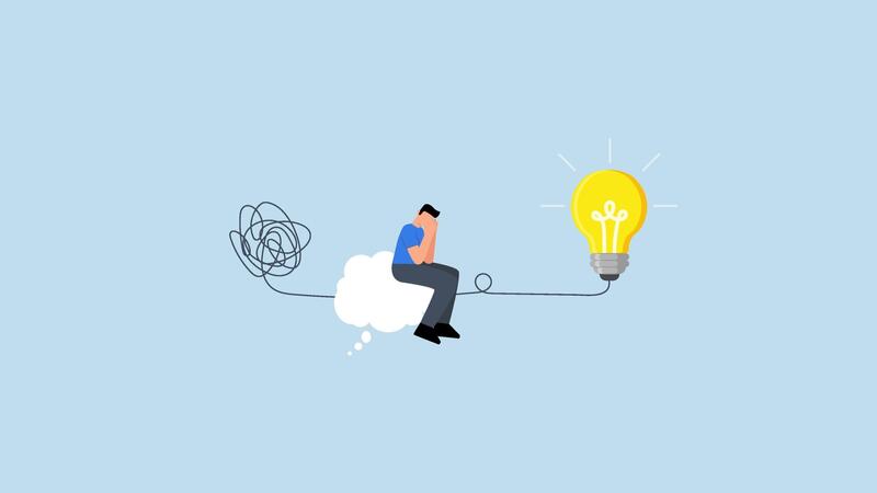 Problem solving skill, entrepreneur in thought cloud linking question mark to lightbulb answer, Pro Video