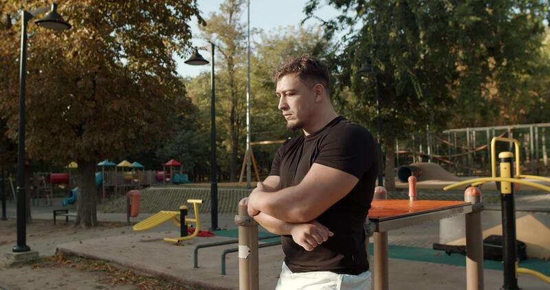 A thoughtful man resting in a park during autumn with a playground visible behind Pro Video