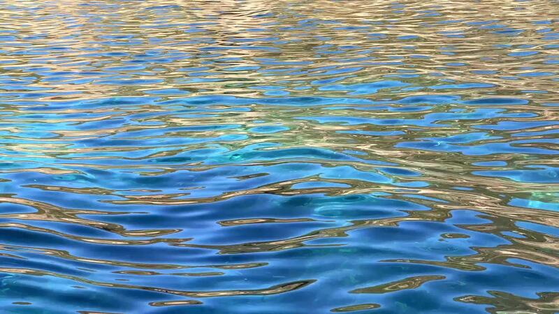 Abstract view of vibrant blue and golden reflections shimmering on the rippled water surface, creating a complex pattern of light and color. Pro Video