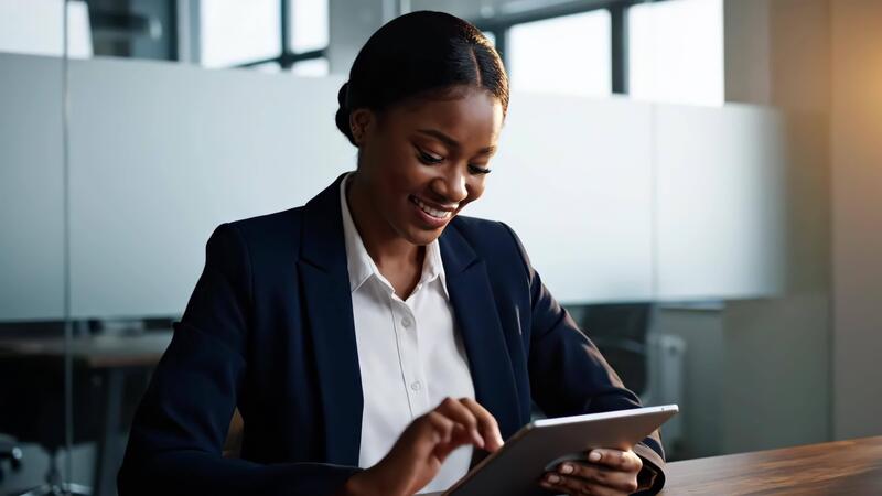 Professional Woman Smiling While Using Tablet Computer in Modern Office During the Daytime Pro Video