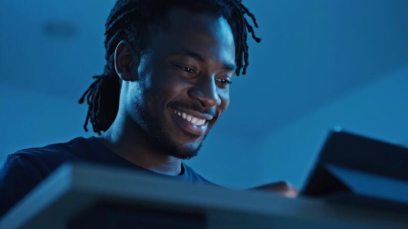 Man With Dreadlocks Smiling While Using a Tablet in the Evening Pro Video