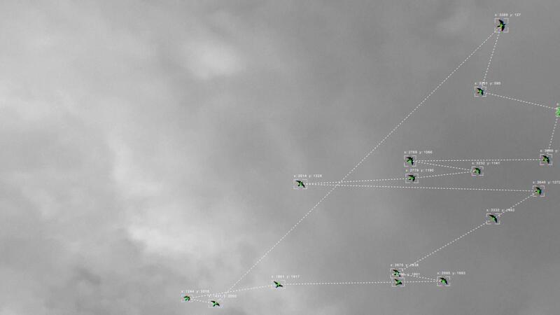 Computer Vision with Object Recognition Scanner Overlay. Big Data. CCTV AI Interface Scanning. Blob Tracking Lines, Coordinates, Bounding Boxes. Plexus style connections. Flying Birds Pro Video