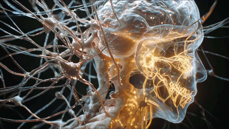 Dynamic sequence shows electrical pulses vividly traveling across transparent nervous system, with each impulse causing segments of neuron network to flash and shimmer. Pro Video