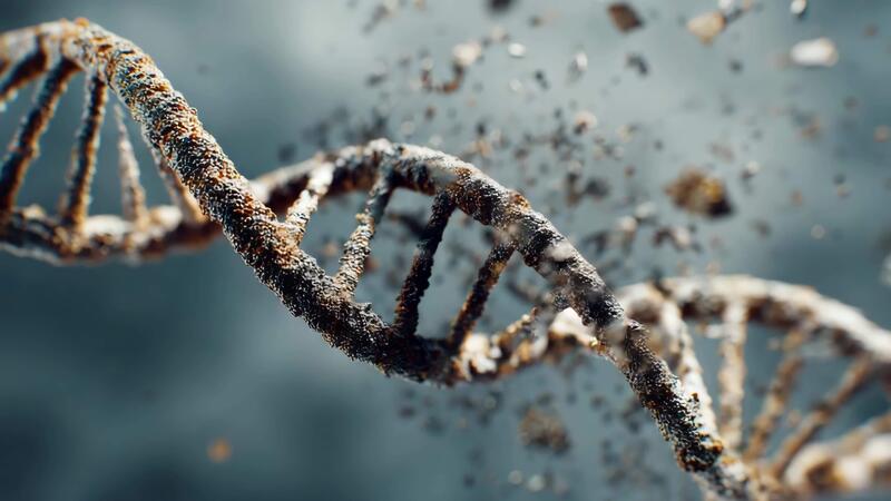 Macro shot depicts DNA double helix in process of repairing after damage, with fragments and molecular particles drifting toward broken gap as strands begin to reconnect and restore original structure. Pro Video