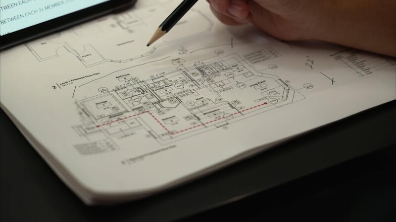 Architecture design project, architect designer engineer brainstorming over interior drawing of building, floor plan, drafting printed on paper. Pro Video