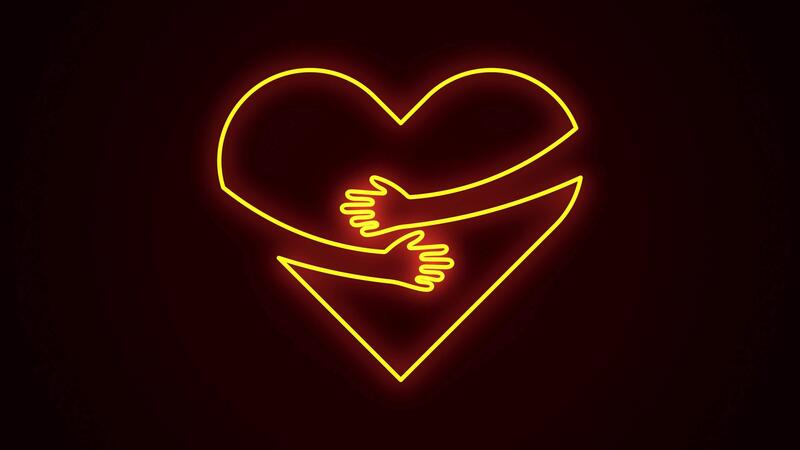 Neon Animation of Hands Hugging a Heart. The sign flickers with a realistic blinking light effect, creating the impression of a lively neon installation. Pro Video