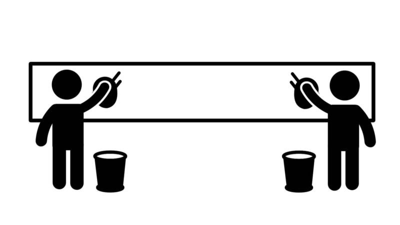 Two workers team up to wipe a large window, ensuring clear visibility and sparkling cleanliness with shared effort Free Video