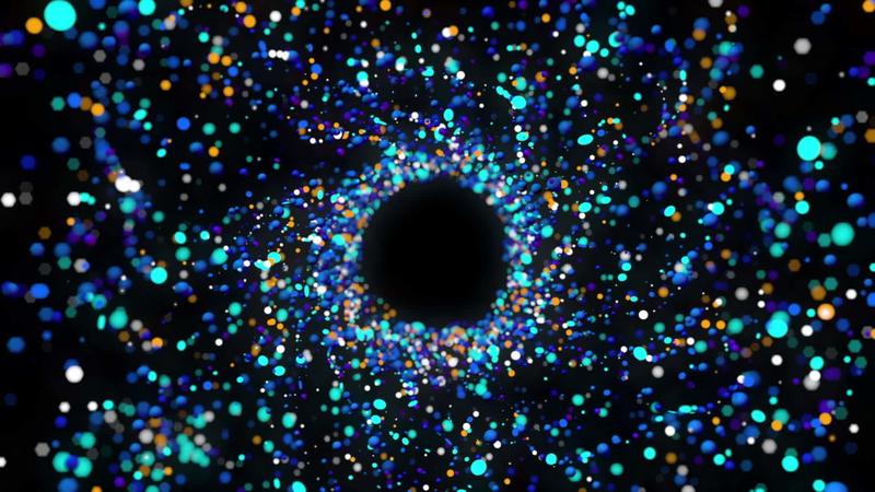 Abstract background of explosion of group of blue, orange and green particles of different sizes moving in a circle shape against an out of focus background in black space. 3d Animation Free Video