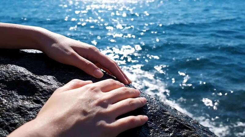 Hands resting on a weathered coastal rock with sparkling sea in the background, creating a Free Video