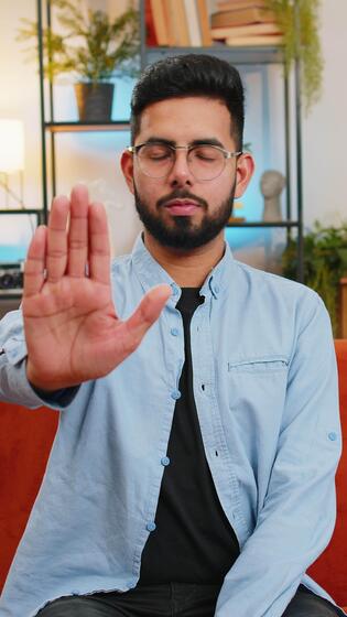 Portrait of Indian young man guy on sofa with serious expression doing stop gesture with both hands at home, warning of finish, prohibited access, declining communication, and body language danger. Pro Video