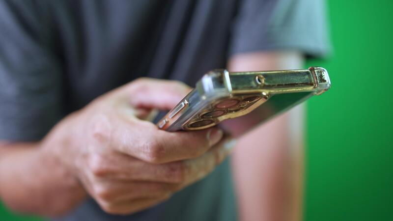 close-up a man using smartphone in front of green screen, showing modern mobile usage, representing digital communication, technology, and a modern connectivity Pro Video