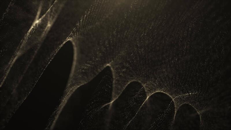A rotating, elegant surface created from digital gold particles. An abstract, glowing wave of particles and dots moves against a blue background, big data visualization, futuristic digital Pro Video