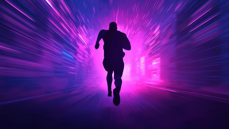 Runner Silhouette Sprinting Through Neon Hyper Speed Tunnel, Futuristic Digital Progress and Motivation Background, Seamless Loop Free Video