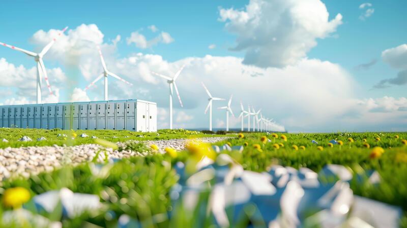 Wind Turbines and Server Racks in Green Field with Clouds Free Video