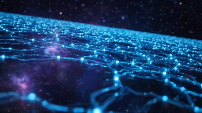 A vast digital neural network of glowing blue nodes and connections flowing through the cosmos, representing data and future technology Pro Video