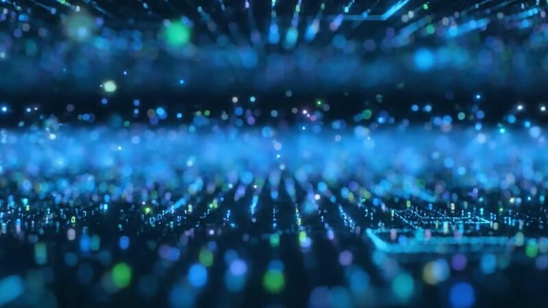 Abstract depiction of blue light particles radiating outward in all directions against a dark background with a shallow depth of field. Pro Video