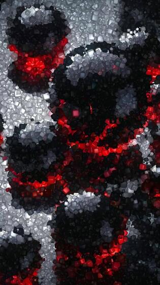 Glossy Black Spheres Veined with Red and White Resting on Reflective Stone in a Surreal Display, Animation Made of Floating Cubes Pro Video