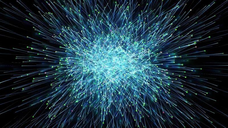 Abstract Digital Starburst Glowing Blue and Green Particle Rays Exploding from Center on Black Background, Abstract Digital Network Burst with Energetic Light Trails Free Video