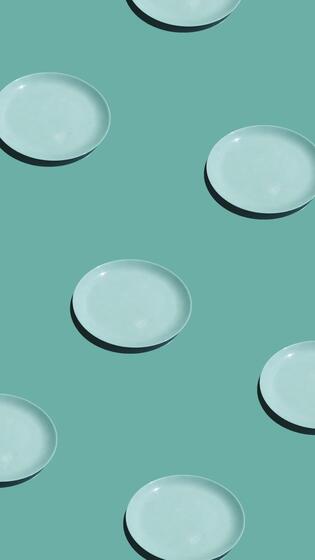 Pattern with lonely fried eggs and many empty plates animated on mint background. Plates move in different directions, vertical footage. Pro Video