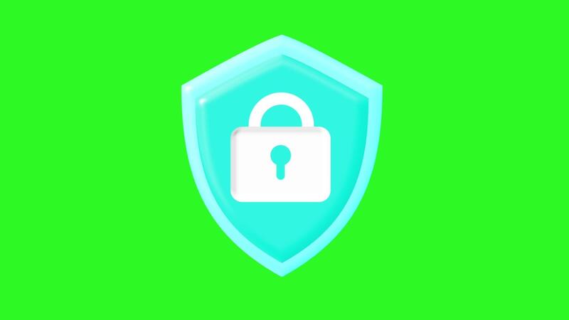 3D security shield icon with an animating padlock on a green screen. Cybersecurity concepts, data protection visuals, and chroma key projects. Pro Video