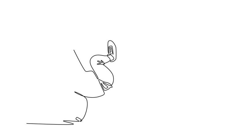 Animated self drawing of continuous line draw young guy balanced on one hand in inverted freeze with leg bent and raised high, challenging power move in breakdancing. Full length single line animation Pro Video