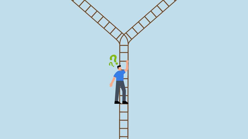 Decision making, Perplexed entrepreneur ascends ladder and discovers intersection to choose path, Pro Video