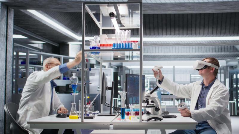 Researcher using VR headset in lab to explore 3D interactive simulations of biochemistry and nanotechnology. Gadget demonstrates innovation in science and advanced research for medicine. Camera A. Pro Video