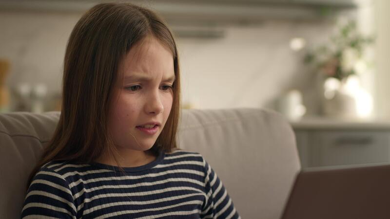 Caucasian child kid daughter girl using laptop feeling shock difficulty problem with online technology sad confused with computer grimacing emotions playing game technology e-learning trouble at home Pro Video