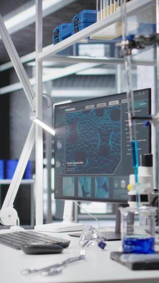 Vertical Empty research lab with specimen samples in jars and other research tools, precision and preparation for experiments. Laboratory setup emphasizes healthcare discovery and molecular analysis. Pro Video