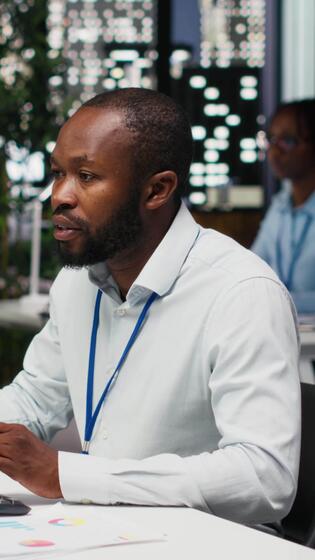 Vertical African american team engaged in business planning and report writing, using company data insights to ensure alignment with objectives. Agenda for future projects, after hours. Camera B. Pro Video
