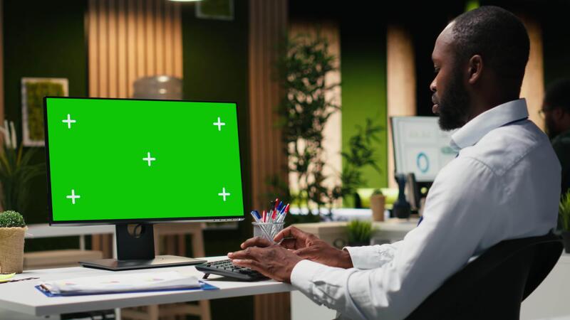 Mockup screen on desktop pc next to young black businessman reviewing data, working on analytics report writing and finding solutions for global expansion and business management tasks. Camera B. Pro Video