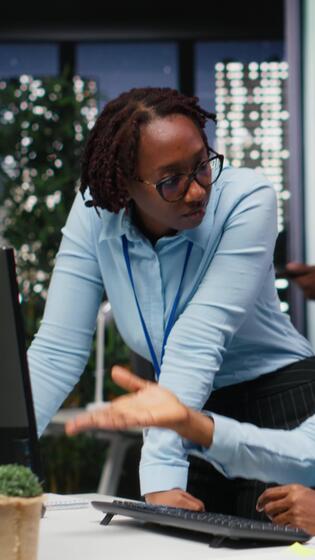 Vertical Business people monitoring efficiency insights at the workspace after hours, utilizing analytics to plan forecast for detailed performance metrics and statements, company management. Camera B. Pro Video