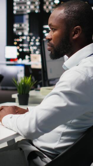 Vertical Male PC user interacting with AI chat system on computer at office after hours, highlighting the evolution of artificial intelligence. Chatbot services and digital tools for productivity. Camera B. Pro Video