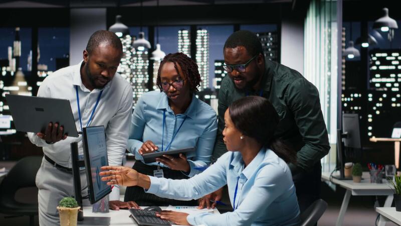 Black executive team analyzing online insights for resources allocation, demonstrating engagement and synergy between coworkers as they prepare performance reports. Networking. Camera B. Pro Video