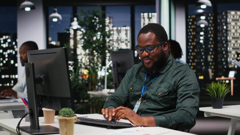 Black male consultant focused on IT company development with digital tools, review analytics and performance metrics at workstation. Staff planning solutions and aligning objectives. Camera B. Pro Video